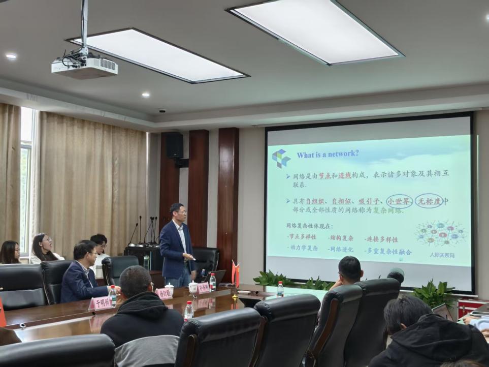 报告中,孙伟刚教授着重探讨了特征谱分析在复杂网络研究中的现状与作用。分别从复杂网络的基本概念、含噪声网络的一致性概念和领导——追随者网络一致性三个方面展开介绍。报告由点及面,深入浅出地分析了小世界网络与无标度网络在现实、理论及其他层面的典型特征,通过拓扑学解析了复杂网络在应用研究时产生的一致性问题,推导了领导——追随者一致性随领导者数量变量变化的解析方程式。该团队的研究为揭示复杂网络一致性规律、精确描述网络拓扑结构与网络动力学特性提供了重要的理论基础与实操框架。报告结束后,师生就复杂网络的研究现状超图、高阶性、多层等问题展开交流,现场学术氛围浓厚。