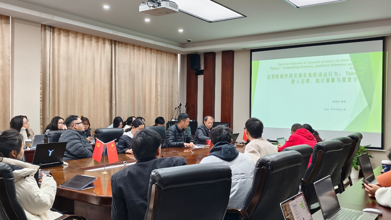 12月12日下午,数据科学学院举行数海领航大讲堂2025年第27期。本期邀请华中科技大学杨晓松教授为全院师生们带来了一场题为“运用时间序列发现系统的动态行为:Takens'嵌入定理、统计推断与深度学习”的学术讲座。讲座由我院副院长郑松教授主持,学院部分教师与研究生参加了此次讲座。 本次讲座聚焦数据驱动下自然与社会动态系统的建模与预测这一前沿交叉领域,系统梳理了相关理论、方法与实践挑战。杨晓松教授首先立足实际应用价值与理论研究意义,阐述了利用时间序列数据解析动态系统行为的重要性与核心难点。随后,讲座回溯微分拓扑的基础理论,详细介绍了微分动力系统中的可观测性理论与Takens嵌入定理,为从离散时间序列中重构系统内在动力特性搭建了坚实的理论框架。在此基础上,杨教授深入探讨了时间序列建模的实践路径,重点讲解了如何借助深度学习技术构建高效的时间序列预测模型与表征模型,为复杂动态数据的解析提供了创新方法。最后,讲座聚焦非线性时间序列的去噪问题,阐明了统计推断方法在剔除数据干扰、提升模型可靠性与预测精度中的关键作用,通过理论阐释、方法拆解与挑战分析的层层递进,全面呈现了该领域的研究脉络与未来发展趋势。 本次讲座兼具理论深度与实践指导价值,让在场师生对时间序列分析与动态系统研究的前沿理论、核心方法及应用场景形成了系统认知。讲座搭建了数学、人工智能、控制理论等多学科交叉融合的交流平台,所分享的Takens嵌入定理应用与深度学习建模思路,为相关领域的科研创新提供了重要理论支撑与方法借鉴。讲座后,师生围绕嵌入定理的实践适配性、深度学习模型的优化方向等问题展开热烈探讨,现场学术交流氛围浓厚,为后续开展跨学科研究注入了新的思路与活力。