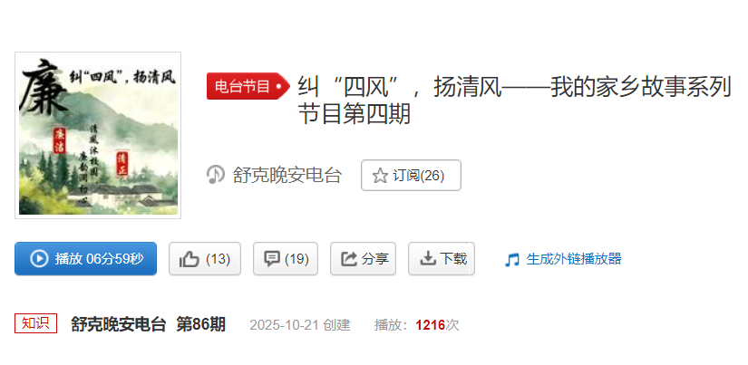 在浙江财经大学数据科学学院,“舒克晚安电台”最新推出的“家乡清风故事”系列节目,将师生们在暑期社会实践中采集的基层故事转化为温暖声波,累计收听量已突破4000次,让清风乡韵真正“声”入人心。